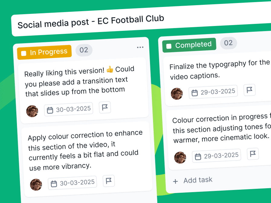 Live feedback becomes actionable inside Flekh Task Manager. Your production team can convert comments into clear tasks, assign them with priority, and monitor execution from kickoff to wrap-up. With task boards connected directly to content, your entire production stays on schedule even when the pressure is on.