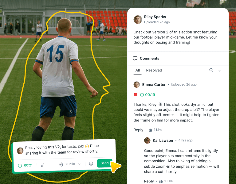 Teams can leave precise comments on assets, highlight critical changes, and tag collaborators instantly. Whether you're reviewing a player highlight or finalizing a promo during halftime, Flekh keeps communication clear and the workflow uninterrupted.