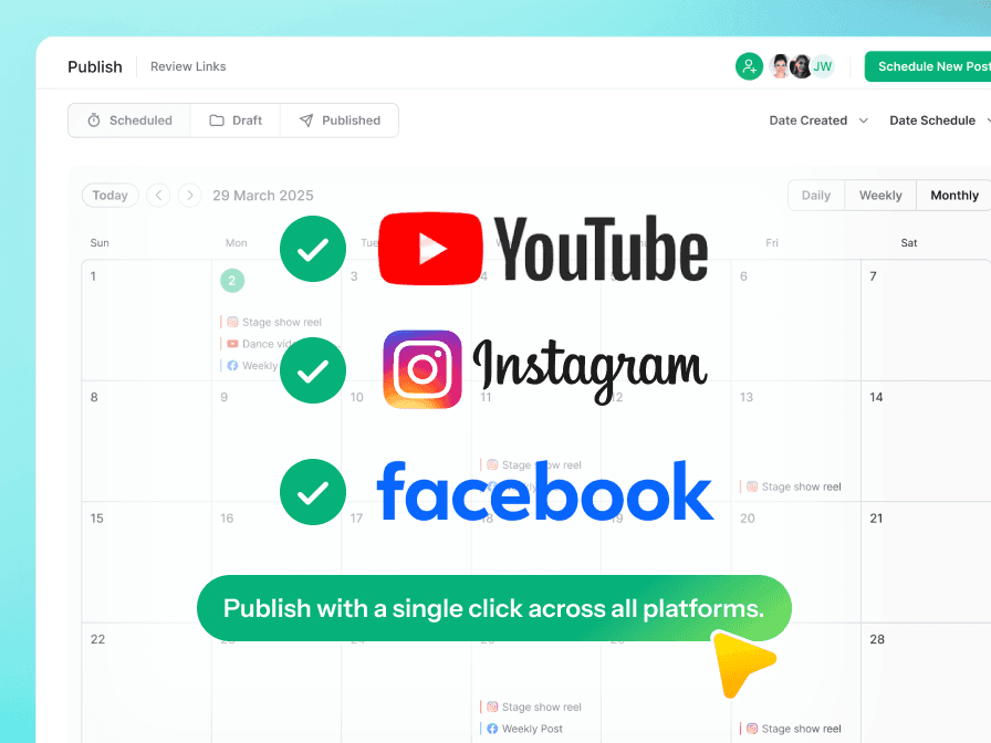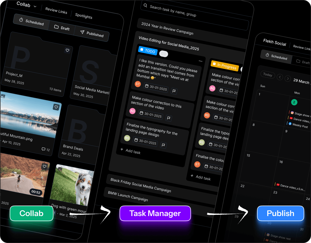 With Flekh Publish, you can manage your own content calendar without extra apps or tools. Draft posts, collaborate on copy, and schedule your content across Instagram, YouTube, Facebook and more from one simple workspace. Perfect for freelancers building a personal brand or side hustlers growing their audience.